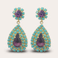 De diepe paarse amethist vormt het stralende middelpunt van deze oorbellen. Daaromheen schitteren fijne turquoise Swarovski kristalletjes. De combinatie van paars en turquoise zorgt voor een luxueus kleurcontrast dat zowel elegant als krachtig oogt.